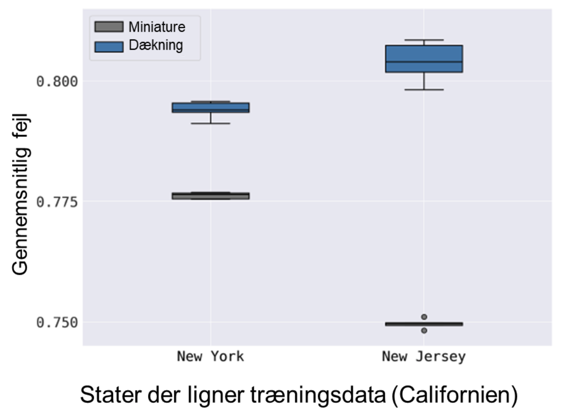 For at sammenligne resultaterne, har Line udregnet modellernes gennemsnitlige fejl (altså hvor ofte modellen laver fejl i gennemsnit), det betyder at jo højere en gennemsnitlig fejl, jo værre har modellen klaret sig. For staterne New York og New Jersey som ligner Californien, kan den gennemsnitlige fejl for de to modeller ses på følgende graf.